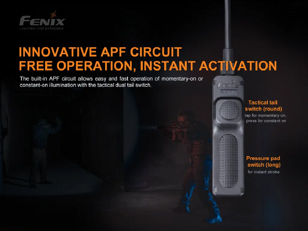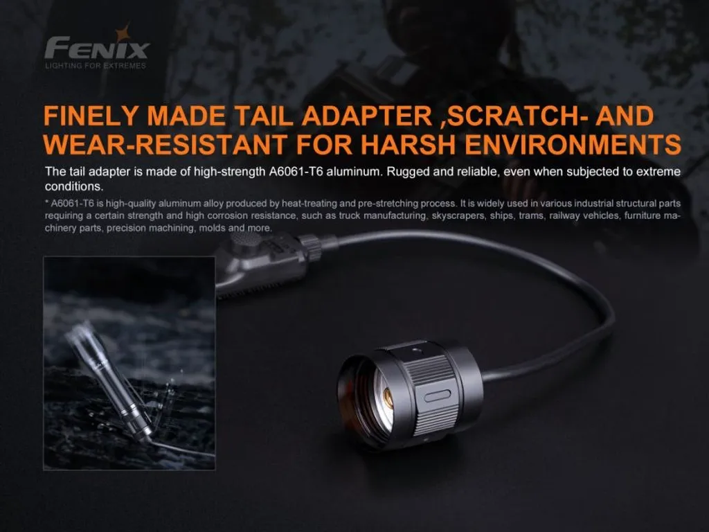 The Fenix AER-05 remote pressure switch is specialized in tactical flashlights with APF circuits. Its tail adapter is made of A6061-T6 aluminum with type III hard-anodized and anti-abrasive finish. The dual tail switch panel includes a silent pressure pad switch and a round tactical switch; allowing easy and fast operation of momentary-on or constant-on illumination. The innovative voiceless design with attached Velcro makes it very reliable and practical in your tactical missions or hunting.