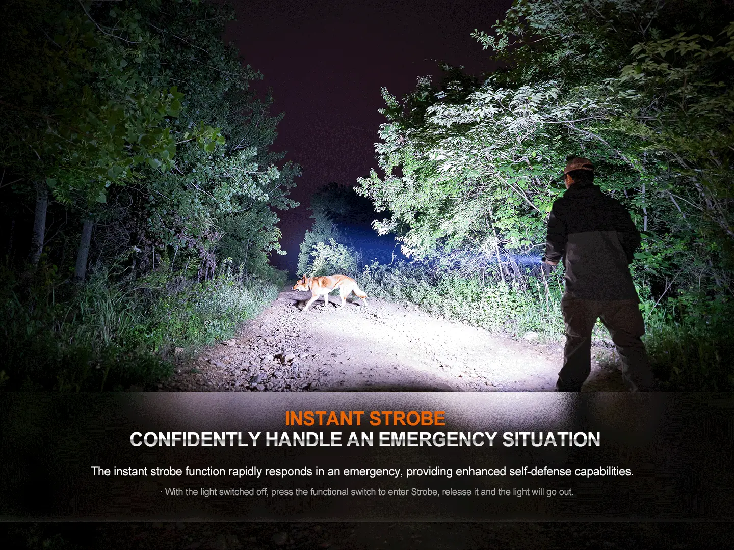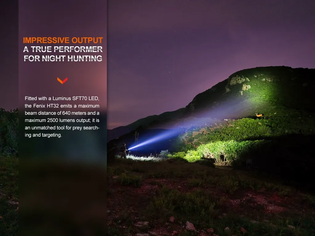 Discover the Fenix HT32 flashlight, a powerhouse of illumination perfect for hunting in Canada. This advanced Fenix flashlight emits a blinding 2500 lumens of white light with a 640-meter reach. Featuring integrated high-power red and green LEDs, it caters to specific hunting needs. The HT32 runs on a single 21700 rechargeable lithium-ion battery, ensuring extended outdoor use. With an IP68 waterproof rating and durable design, it's ready for any environment. The tactical tail switch allows seamless operation, while USB Type-C charging adds convenience. Elevate your hunting experience with this versatile and reliable Fenix flashlight.